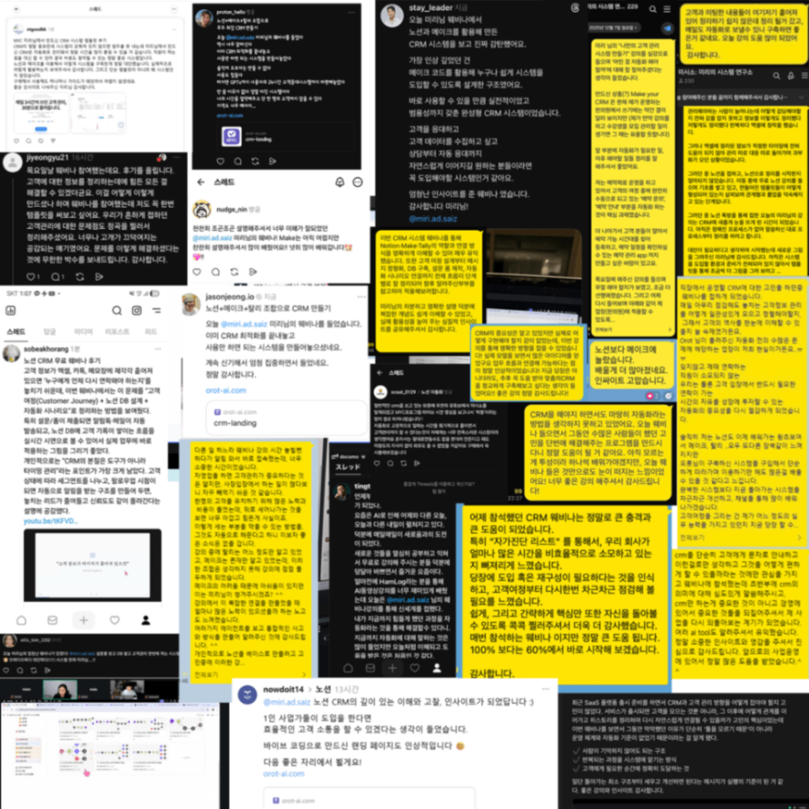 ์ง๋์ฃผ ์ธ์ด ์ ๋ต์ ๋๋์ด ์คํ์ ์ฎ๊ฒผ๋ค. CRM ์์คํ ๋ฌด๋ฃ ์จ๋น๋ ๊ณต์ง๋ฅผ ์ฌ๋ ธ๋ค. ์ค๋ฌธ์ง๋ก ์ ์ ์ํค๊ณ , ์ ์ฒญ ์๋ฃ ํ ์๋ฆผํก์ผ๋ก ์คํํก๋ฐฉ ๋งํฌ๋ฅผ ๋ณด๋ด๋ ์๋ํ ๊ฒฝ๋ก๋ฅผ ๋ง๋ค์๋ค. ๊ทธ ๊ฒฐ๊ณผ ์ ์ฒญ์ 21๋ช , ์คํํก๋ฐฉ ์ฐธ์ฌ ์ธ์ 28๋ช ์ด ๋์๋ค. ๋ง์ ์ซ์๋ ์๋์ง๋ง, ๋ด๊ฐ ๋ง๋ ์ฒซ ๋ฒ์งธ ํผ๋์ด ์๋ํ๊ณ ์๋ค๋ ๊ฒ๋ง์ผ๋ก๋ ์ถฉ๋ถํ ๋๋ ฅ์ด ๋์๋ค. ๋๋ฉํ์ด์ง๋ฅผ ๋ง๋ค๋ค ๋ฐ์ด๋ธ์ฝ๋ฉ์ผ๋ก ๋๋ฉํ์ด์ง๋ฅผ ์ ์ํ๋ค. ๊ธฐํ์ ์๋ฌด๋ฆฌ ์ง๋ ๋ง์์ ๋ค์ง ์์๋ค. ๊ทธ๋์ ์ผ๋จ ์์ฑ๋ถํฐ ํ๊ณ ์์ ํ์๋ ๋ง์์ผ๋ก ์์ฑ๋ถํฐ ํ๋ค. https://crm-landing-deploy. vercel. app/ ์ด๊ฑธ ์ํด PG์ฌ ๊ณ์ฝ๋ ํ๊ณ , ๊ฒฐ์ ์์คํ ์ฐ๋๋ ํด๋๋ค. (ํ ์คํธ ๊ณ์ ์ผ๋ก ์ฐ๋ํด๋์๋ค. ) ๋ง์คํฐ๋ง์ธ๋์ ๋ํ๋๋ค์ด ๋ชจ๋ ํผ๋๋ฐฑ์ ํด์ฃผ์ ์ ์์ ๋ฐฉํฅ์ด ์กํ๋ค. ์น ๊ฐ์ ์์ ์์ . ์ด๋ฒ์ฃผ ์ค์ ์์ ์ ์งํํ ์์ ์ด๋ค. ํ์ฅ์์ ์ ํ์ ๊ฒ์ฆํ๋ค ๋ง์คํฐ๋ง์ธ๋ ๋ํ๋๋ค์๊ฒ CRM์ ์ง์ ๊ตฌ์ถํด๋๋ฆฌ๊ธฐ ์์ํ๋ค. ํ์ฌ 2๋ช ์๋ฃ, 3๋ช ๋๊ธฐ ์ค์ด๊ณ , ์์ธ ์ผ์ด์ค 2๊ฑด์ด ๋ณ๋๋ก ์งํ ์ค์ด๋ค. ๋๋ ์ฒ์๋ถํฐ ํ๊ฒ์ด ๋ช ํํ๋ค. ์ง์ ์ฐฝ์ ์, ๊ทธ๋ฆฌ๊ณ ์ค๋ฌธ์ง ๊ธฐ๋ฐ์ผ๋ก ๋น์ฆ๋์ค๋ฅผ ์ด์ํ๋ ์ฌ๋๋ค. ์๋ด ์ ์ฒญ์, ์์ฝ ํผ, ๊ตฌ๋งค ๋ฌธ์์๋ฅผ ํตํด ๊ณ ๊ฐ์ ๋ง๋๋ ์ด๋ค์ด ๊ณตํต์ ์ผ๋ก ๊ฒช๋ ๋ฌธ์ ๊ฐ ์์๋ค. ์ค๋ฌธ์ง ์๋ต์ด ์ฌ๊ธฐ์ ๊ธฐ ํฉ์ด์ ธ ์๊ณ , ๋งค๋ฒ ์๋์ผ๋ก ๋ณต์ฌํด์ DB์ ์ฎ๊ธฐ๊ณ , ๊ณ ๊ฐ ์๋ต๋ ์ผ์ผ์ด ์์ผ๋ก ๋ณด๋ด์ผ ํ๋ฉฐ, ์ด๋ค ๊ณ ๊ฐ์ด ๋ญ ์์ฒญํ๋์ง ์ถ์ ์กฐ์ฐจ ์ ๋๋ค๋ ๊ฒ. ๋ด ์์คํ ์ ์ด ์ง์ ์ ์ ํํ ์ฐ๋ ๋ค. ์ค๋ฌธ์ง ์๋ต์ด ๋ค์ด์ค๋ฉด ์๋์ผ๋ก DB๊ฐ ์์ฑ๋๊ณ , ์ค์ DB์ ํตํฉ๋๋ฉฐ, ๊ณ ๊ฐ ์ ๋ณด๊ฐ ์ ๋ฐ์ดํธ๋๊ณ ์ค์ ํด๋ ์๋ต์ด ๋ฉ์ผ, ๋ฌธ์, ์นดํก ์๋ฆผํก, ์น๊ตฌํก์ผ๋ก ์๋ ๋ฐ์ก๋๋ค. ํ์ํ๋ฉด ์๋ ๋ฐ์ก๋ ๊ฐ๋ฅํ๋ค. ๋ง์คํฐ๋ง์ธ๋ ๋ํ๋ 7๋ช (์๋ฃ 4๋ช + ๋๊ธฐ 3๋ช )์ด ์ด ํ๊ฒ์ ๋ง์๋จ์ด์ก๊ณ , ์์คํ ๊ตฌ์ถ๋ ์์กฐ๋ก์ ๋ค. ๊ทธ๋ฐ๋ฐ 2๊ฑด์ ์์ธ ์ผ์ด์ค๊ฐ ์์๋ค. ์ง์ ๋ํ๋์ ์ค๋ฌธ์ง๊ฐ ์๋ ํํ์ด์ง ์์ฝ ์์คํ ์ ์ฐ๊ณ ๊ณ์ จ๋ค. ๋ด ์ ํ์ ํ๊ฒ ๋ฐ์ด์์ง๋ง, ๋๋ ์์ ํ ์๋ก ์ค๊ณํ๋ ๋ฐฉํฅ์ผ๋ก ๊ฐ๋ค. ์์ฝ ์์คํ ๊ณผ CRM์ ์ฐ๋ํ๊ณ , ๊ทธ๋ถ๋ง์ ํ๋ก์ธ์ค์ ๋ง์ถ ์๋ํ ํ๋ฆ์ ๋ง๋ค์๋ค. ๊ทธ ๊ณผ์ ์์ ํ๊ธฐ ์์ง ์๋ํ๋ ํจ๊ป ์ธํ ํ๋ค. ์์ธ ์ฑ๊ณผ ๋ฉ์ผ๋ก ์๋ ์์ฒญ์ด ๊ฐ๋๋ก. ๋ ๋ค๋ฅธ ํ ๋ถ์ ์ฌ๋ฌ ๋ฃจํธ์์ ๋ค์ด์ค๋ ์ ๋ณด๋ฅผ ํตํฉํด์ผ ํ๋ ์ผ์ด์ค์๋ค. ๋จ์ํ ์ค๋ฌธ์ง ํ๋๋ง ์ฐ๊ฒฐํ๋ ๊ฒ ์๋๋ผ ์ ์ฒด ๋น์ฆ๋์ค ์์คํ ์ ์ฌ์ค๊ณํด์ผ ํ๋ ์์ค์ด์ด์, ์๊ฐ์ด ๋ ํ์ํ ์์ ์ด๋ค. ์ ํ๊ณผ ์๋น์ค๋ ๋ค๋ฅด๋ค. ๊ทธ๋ฆฌ๊ณ ์๋น์ค๋ ๋ ๋ฒจ์ด ์๋ค. ์ ํ = ์ค๋ฌธ์ง ๊ธฐ๋ฐ CRM ์๋ํ (ํ์คํ, 80%) ์๋น์ค Level 1 = ๋จ์ผ ์์คํ ๋ง์ถค ์ค๊ณ (์ง์ ๋ํ๋ ์ผ์ด์ค) ์๋น์ค Level 2 = ๋ณตํฉ ์์คํ ํตํฉ ์ค๊ณ (์ฌ๋ฌ ๋ฃจํธ ํตํฉ ์ผ์ด์ค) ํ์ค์ผ๋ก 80%๋ฅผ ์ปค๋ฒํ๊ณ , ๋ง์ถค ์ค๊ณ๋ก ๋๋จธ์ง 20%๋ฅผ ํด๊ฒฐํ๋, ๋ณต์ก๋์ ๋ฐ๋ผ ์๊ฐ๊ณผ ๊ฐ๊ฒฉ์ด ๋ฌ๋ผ์ง๋ค. ํด์ธ ๋ ํผ๋ฐ์ค๋ฅผ ์๋์ผ๋ก ์์งํ๋ค ์ง๋ ์ฌ์ ์ผ์ง์์ ํด์ธ ์ ํ๋ธ ์ฝํ ์ธ ๋ฅผ ์์งํ๊ณ ๋ถ์ํ๋ ์์คํ ์ ๊ตฌ์ถํ๊ฒ ๋ค๊ณ ํ์๋ค. ๊ทธ๊ฑธ ์ด๋ฒ ์ฃผ์ ๋ง๋ค์๋ค. ๋ฑ๋กํด๋ ํด์ธ ์ ํ๋ธ ์ฑ๋์ ์์์ด ์ฌ๋ผ์ค๋ฉด, ๋งค์ผ ์์นจ ์